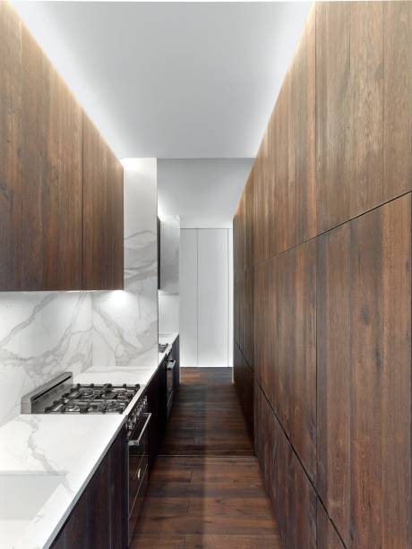 Ao todo, o apartamento tem sete grandes janelas voltada para o sul, que oferecem uma vista cada vez mais rara do distrito de Flatiron. Para criar volumes interessantes no interior, a arquiteta brincou com as alturas do teto: eles são mais baixos no corredor, e no escritório e na área de estar, tem um pé-direito alto para aproveitar toda a luz natural que entra pelas janelas.