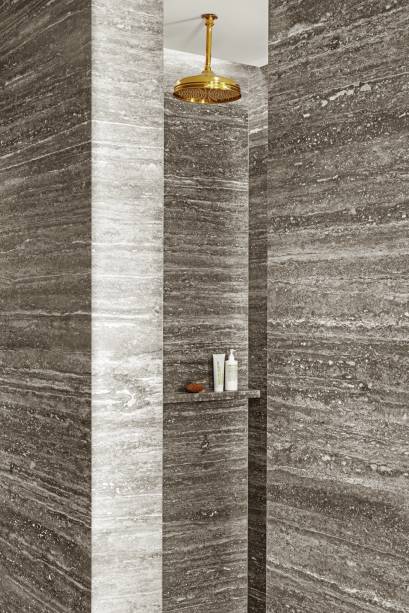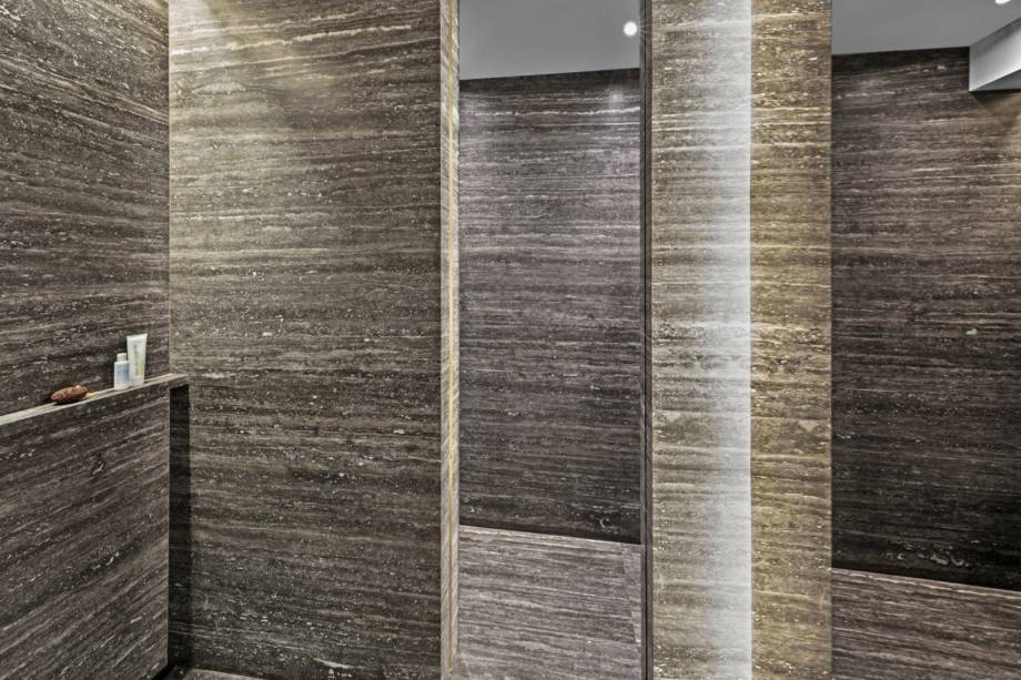 Para o banheiro, a arquiteta escolheu o mármore travertino brioni, que cobre o piso, a maior parte das paredes, a pia e a prateleira. Os armários duplos foram disfarçados com grandes espelhos para banheiro e revestidos de metal. Enquanto o vidro do box foi pintado de cinza para criar sensação de amplitude.