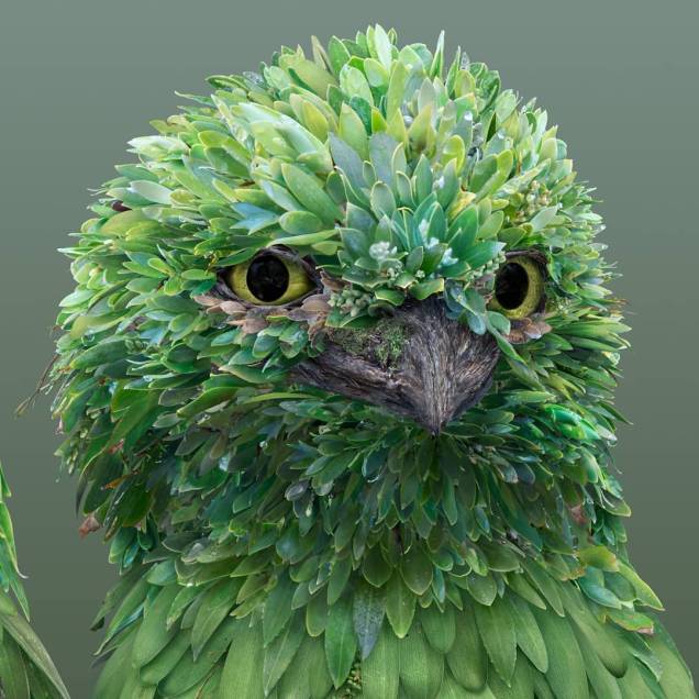 Em “Terraform”, Dykgraaf reconstrói elementos da terra em fauna – a culminação de incontáveis horas de exploração, literal e artística. Enquanto viajava pelo mundo, o artista desenvolveu um banco fotográfico de milhares de paisagens e texturas, que ele usou para criar trabalhos como “Kulu” – um pangolim enrolado feito de folhas e pétalas de flores de magnólia – e “Bunyjul” – um dragão com babados feito de flores protea.