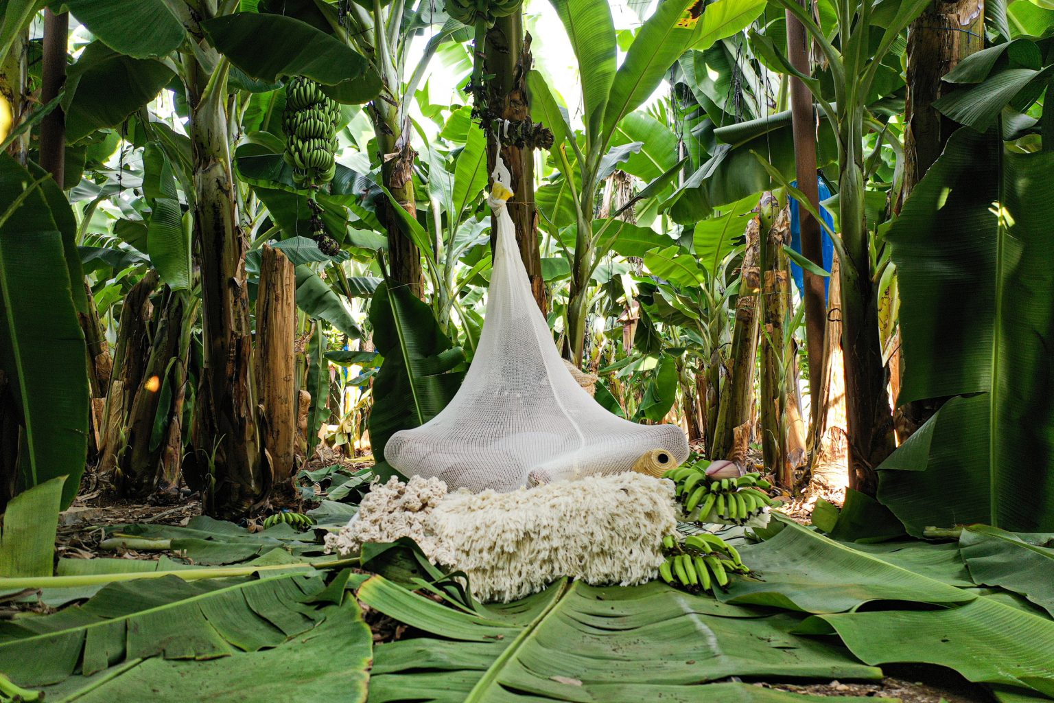 A bananeira é a única planta presente, simbolizando a monocultura nesta realidade imaginária chamada de Tropical Milan, que também inclui problemas como excesso de mosquitos e umidade. Os objetos sustentáveis e os vídeos da obra foram expostos este mês em uma instalação em Milão, na Itália.
