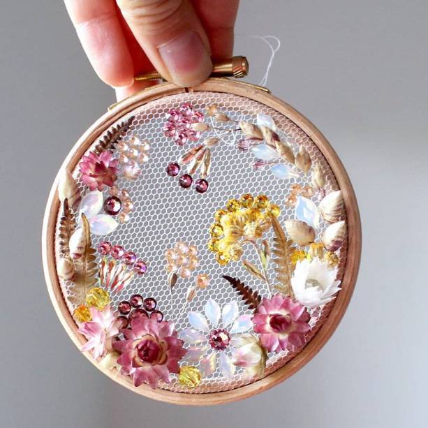 Flores desabrocham nos bordados desta artista