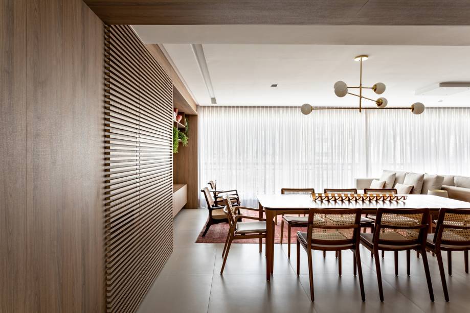 A madeira, por sua vez, entra em cena para aquecer e trazer aconchego onde o décor neutro predomina. Painéis ripados aparecem em boa parte do projeto, revestindo as paredes. Já para escolha do mobiliário, os profissionais elegeram peças com design contemporâneo nacional. Destacam-se aqui as poltronas MAD e mesinhas de apoio de Jader Almeida.