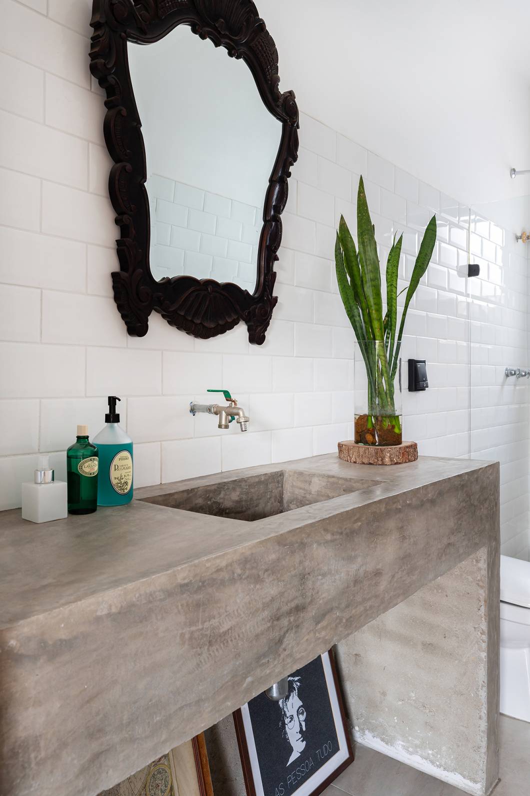 Parede de tijolos, concreto aparente, cimento queimado e subway tiles marcam o projeto de Espacial Arquitetos