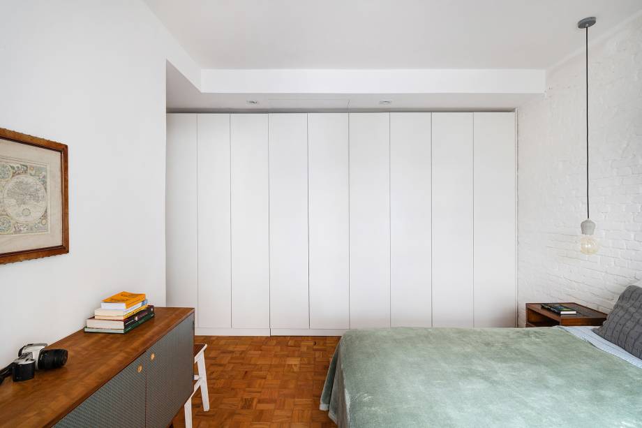 A suíte era um dos pontos de desejo do morador, que possuísse um espaço bem generoso e, principalmente, armários grandes e espaçosos. O layout do quarto seguiu o mesmo conceito arquitetônico dos outros ambientes e, assim como todo o resto, a iluminação foi planejada para criar uma atmosfera acolhedora e aconchegante, entregando luminosidade apenas nos locais desejados e necessários.