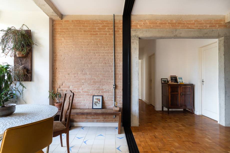 Como a estrutura de todo apartamento é feita de alvenaria de tijolos de cerâmica antiga, foi necessário estudos na hora de fazer demolições. Na cozinha, para retirar a alvenaria de tijolos, o escritório planejou e teve a validação de um engenheiro para a instalação de uma viga metálica preta de 5 m atravessando a sala. Optaram por deixar o concreto aparente e usar subway tiles para reforçar o estilo industrial.