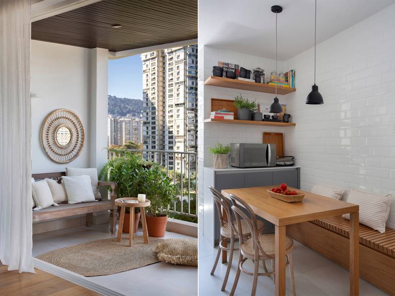 Outro destaque no projeto é a esquadria da varanda com todas as portas de correr, permitindo sua total integração com a sala, e a cozinha com copa integrada, que ganhou um extenso banco ripado, executado em marcenaria tipo baú, com espaço interno de armazenamento.