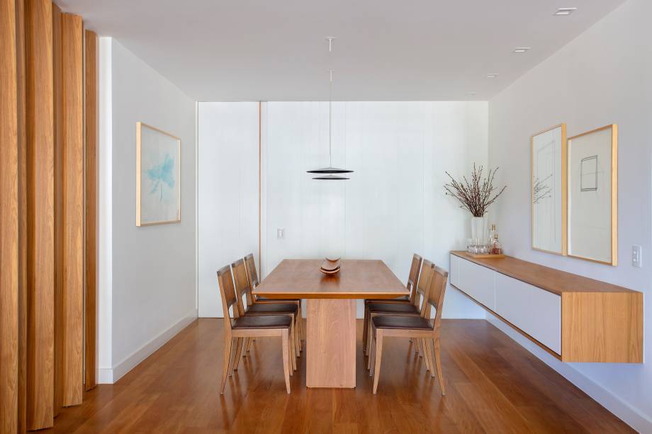 Para isso, as arquitetas eliminaram todas as paredes que criavam algum tipo de barreira e, no lugar delas, instalaram painéis piso-teto, com aletas reguláveis executadas em marcenaria, que funcionam como divisórias que integram ou isolam a sala de estar, de jantar e o hall de entrada, de acordo com a necessidade.