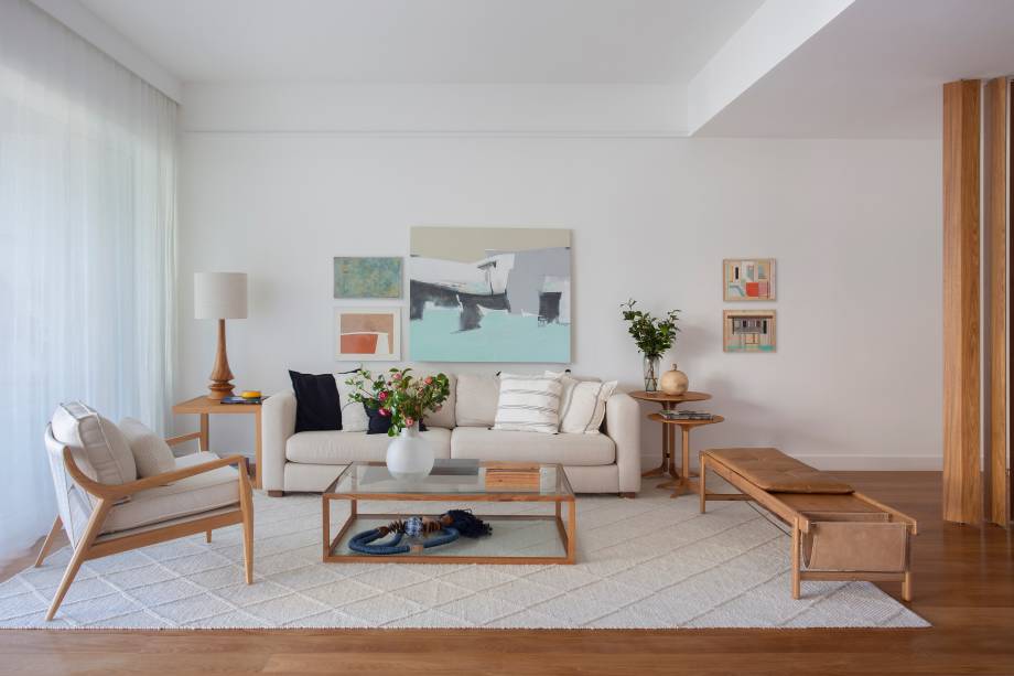 Além disso, as arquitetas adotaram uma paleta de cor em tons neutros, com muita madeira (presente no piso, marcenarias e mobiliário), associada a materiais também naturais com o linho, couro, algodão e fibras. Os toques de cor, ainda que suaves, aparecem, principalmente, nas obras de arte.