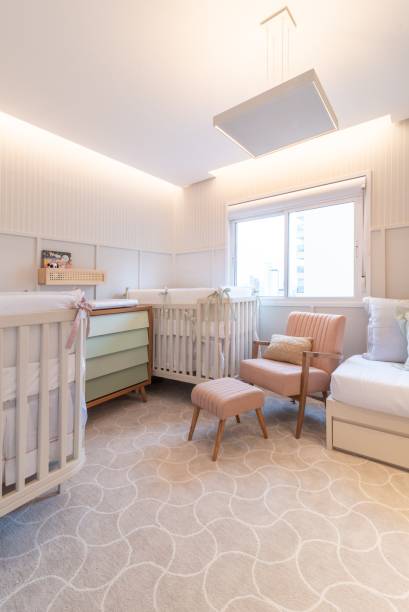 A princípio, os bebês compartilharão o mesmo quarto, que ganhou dois berços brancos divididos por uma cômoda de madeira com gavetas em tons de verde. A paleta de cores é neutra, com papel de parede listrado e lambri cor “Ouro Branco” da Suvinil, o que possibilita a fácil adaptação do espaço para acompanhar o crescimento das crianças.