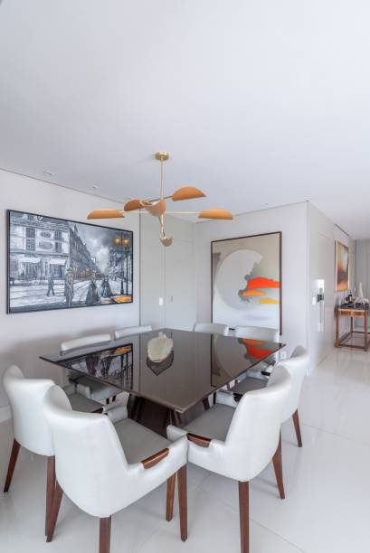 No jantar, quadros e uma escultura da coleção do cliente compõem o ambiente com sofisticação e personalidade. As obras de arte ganharam destaque com spots direcionados.