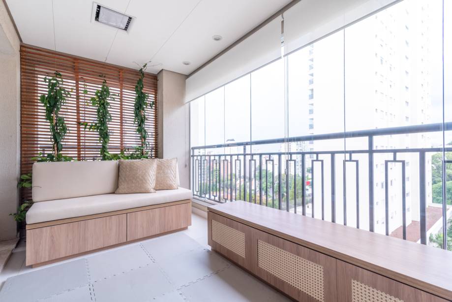 Uma parte da varanda virou área multiuso com uma marcenaria que serve como banco e conta com espaço para armazenar os brinquedos que, logo mais, serão muito aproveitados pelos pequenos. As divisórias vazadas ajudam as plantas a crescerem.
