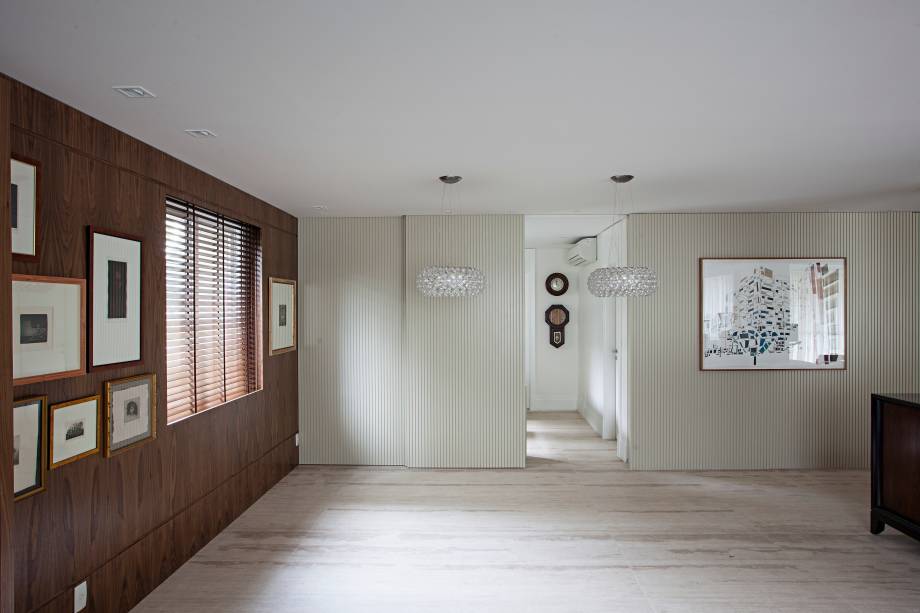 Outro desafio era a proporção da reforma, que teve parte hidráulica, elétrica, alvenaria, piso e forros completamente renovados. A iluminação foi um ponto de atenção para destacar as obras de artes dos proprietários e também trazer o acolhimento e bem-estar necessário para os ambientes. O pé-direito era muito baixo, exigindo atenção e soluções para instalar o sistema de ar-condicionado, então, o forro foi rebaixado em sua área central e uma sanca iluminada foi colocada neste espaço.