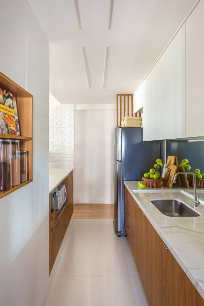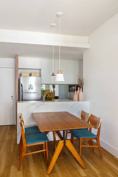“Apesar de o apartamento ser compacto, os clientes queriam manter os três quartos originais para que cada filho tivesse seu próprio espaço e ainda instalar uma bancada em cada dormitório, pois é bem comum a família inteira estar em casa ao mesmo tempo, trabalhando ou estudando”, conta Ana Luisa.