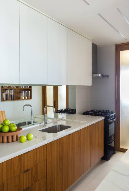 A integração da cozinha com a sala viabilizou a criação de uma ilha que funciona como apoio para os dois ambientes e ainda possibilitou a criação de armários sob ela. O uso do espelho no backsplash entre a bancada e os armários superiores fez a cozinha parecer mais ampla e sofisticada.