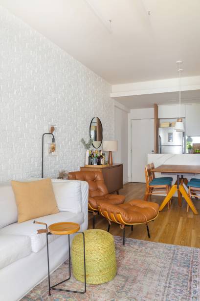 Na decoração, que segue o estilo “cozy” com elementos contemporâneos, apenas o sofá (que recebeu uma capa de sarja branca) e a bancada da TV (que ganhou portas novas em muxarabi no lugar das antigas, em laca preta brilhosa) foram reaproveitados do antigo apartamento.