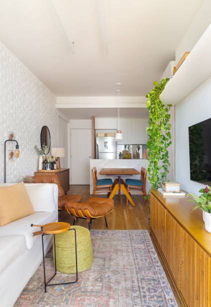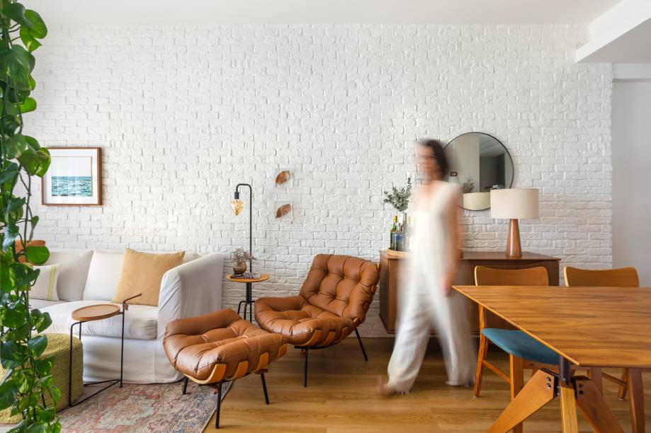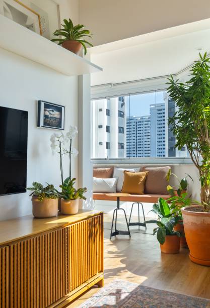 A paleta de cores é pautada em uma unidade estética neutra que permeia os cômodos principais, composta por diferentes texturas e materiais – como madeira, tijolinho, couro, palha, linho, vasos de barro e plantas naturais. “A integração da varanda com a sala foi fundamental nesse processo, pois trouxe mais vegetação e luz natural para a área do estar”, avalia Gustavo.