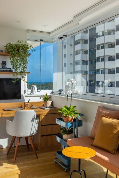 A varanda também recebeu um escritório, ao lado de um banco de marcenaria que funciona como baú e serve para armazenar documentos e livros pouco acessados.