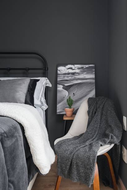 Uma das apostas da designer de interiores foi trabalhar com móveis soltos e as cores, principalmente nas paredes, com cinza, cimento queimado e branco. Além disso, foi fácil conseguir uma decoração personalizada porque o morador tem algumas paixões, como a fotografia, as motos e a vida agitada da capital paulista. “Só isso já transmite toda a energia necessária que o projeto precisa! Ele também queria um quarto bem imponente, uma paleta de cores mais sóbrias, mas ao mesmo tempo, aconchegante e estiloso”, conta.