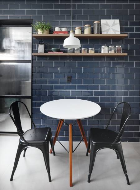 Dessa forma, resolveram ampliar o vão da porta e colocar uma porta de vidro para integrar os dois espaços. Para os acabamentos, escolheram acabamentos em tons de cinza a fim de trazer um toque minimalista e metais e serralheria na cor preta para destacar a parede de subway tiles azul marinho, que também pode ser visto por quem está na sala de estar.