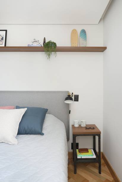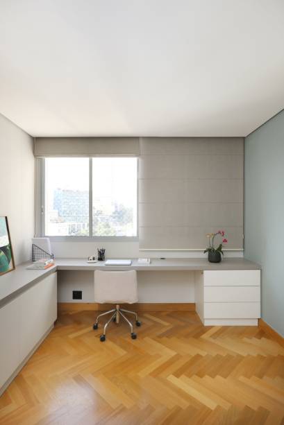 Bastante antigo, o apartamento nunca tinha sido reformado. “Fizemos uma boa renovação de tudo, desde piso, revestimentos, portas, marcenaria até hidráulica e elétrica. O único item que mantivemos foi o guarda-roupas do home office, que foi reformado externamente”, comenta a arquiteta Lívia Leite.