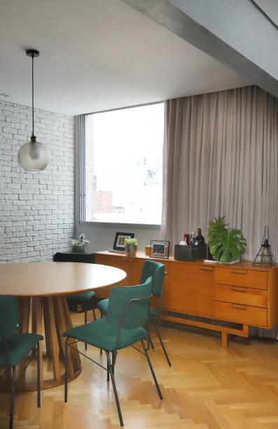 Projeto aproveitou a parede de tijolinhos e incluiu pitadas de cores em alguns móveis