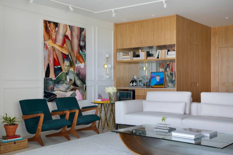 Outro destaque do living são os painéis de madeira que revestem algumas paredes. Foi um pedido da moradora, que adorava esse revestimento no apartamento anterior. A única exigência foi uma madeira mais clara no projeto atual e a escolhida foi o carvalho americano. Esse recurso ajudou a camuflar na própria marcenaria a porta de acesso e as demais portas que são para a sala.