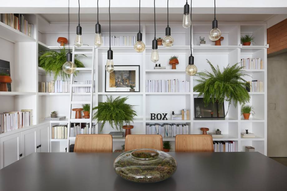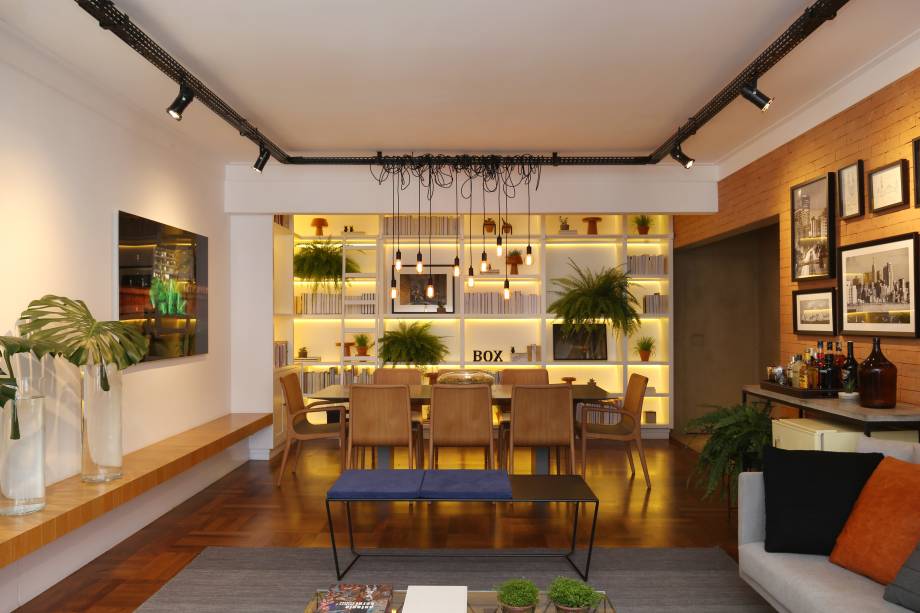 Na sala de estar e jantar, chama a atenção o projeto luminotécnico. Como a ideia era iluminar melhor o cenário noturno sem grandes esforço de obra, a ideia foi usar spots distribuídos em eletrocalhas para reforçar a claridade na área da TV. No jantar, um pendente desenhado pelo próprio arquiteto reúne lâmpadas de filamento de cobre penduradas em alturas variadas e presas na própria eletrocalha. Ao fundo, uma estante abriga livros, peças de decoração, vasos e pequenas samambaias. À noite, fitas de LED iluminam os nichos destacando este canto do espaço para receber.
