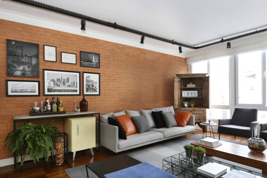 A parede revestida de tijolinho na sala e a iluminação com spots distribuídos por eletrocalhas revela a inspiração industrial deste apartamento de 120 m2 para um jovem de 30 anos no bairro central de Santa Cecília, em São Paulo. Com uma planta bem aproveitada, o arquiteto Leandro Mostardo, do escritório Box14, optou por fazer pequenas intervenções e reforçar as boas características do imóvel: iluminação farta, proporcionada pelas amplas janelas, e cômodos amplos.