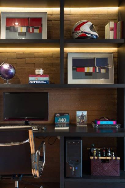 A marcenaria planejada é outra aliada do projeto. Armários pretos na cozinha e estante da mesma cor na área de descanso dão unidade aos ambientes. No armário do quarto, espelhos nas portas de correr fazem o espaço parecer maior.