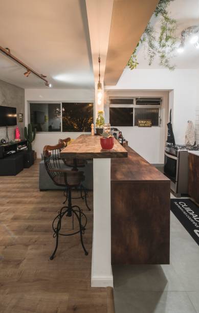 “Decidimos pela demolição de praticamente 80% das alvenarias, deixando o apartamento amplo e conectado, proporcionando maior ventilação e iluminação, como também mais flexibilidade de uso”, conta André Chukr, sócio de Luís Canepa. Assim, não há portas separando o living do quarto e da cozinha americana, com uma ampla bancada de madeira de demolição servindo de balcão.