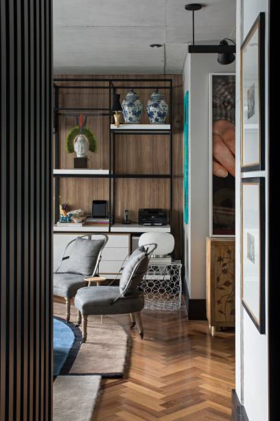 No quarto, único espaço mais reservado, chama a atenção a cabeceira composta de requadros de madeira com palha natural ebanizada. Do outro lado, o armário recebeu acabamento de laca fosca grafite – para manter a paleta de sobriedade de todo o apê.