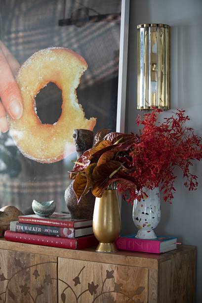 Os tons mais vibrantes ficaram apenas nos acessórios, que dão charme e personalidade à casa. Repare nos arranjos de mesa e nos enfeites da estante e do aparador. O mobiliário mistura retrô e contemporâneo, assim o sofá curvo vintage harmoniza com poltronas propositalmente de cores diversas no living. Já a sala de refeições ganhou clássicos do design, como a mesa Saarinen e as cadeiras Charles Eames.