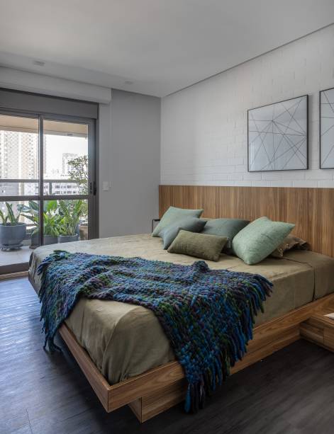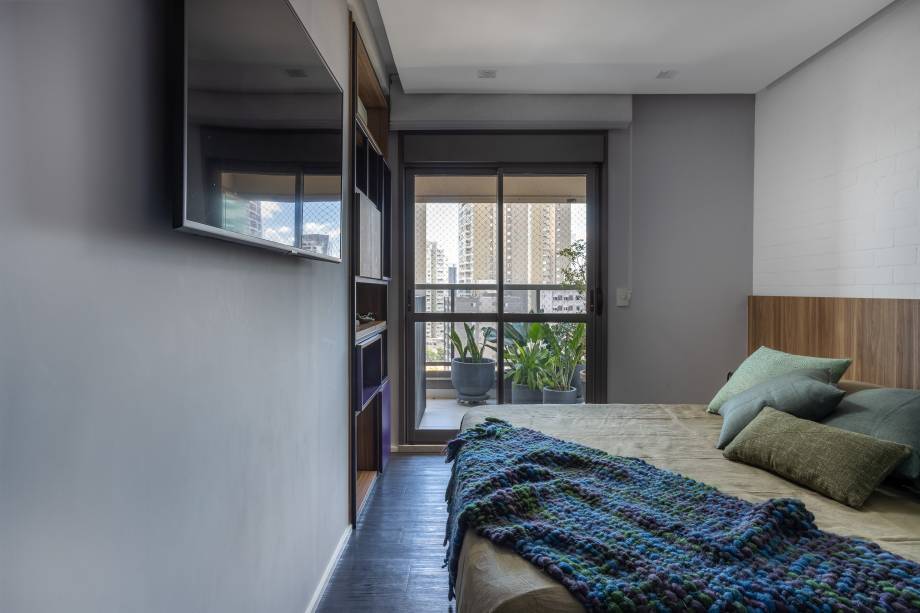 Na área íntima, a arquiteta fez algumas modificações estruturais para atender às necessidades do casal. A demolição da parede da cozinha permitiu a ampliação da suíte master, que agora abriga uma cama maior e um closet.