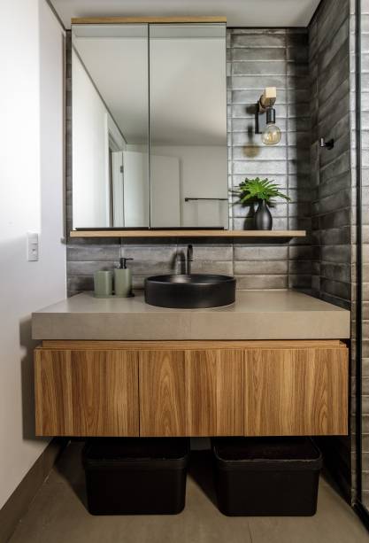 O projeto luminotécnico com trilhos e luminárias pretas adiciona um toque urbano e casual ao ambiente, realçando as texturas e cores que se mesclam entre o cinza e o amadeirado.