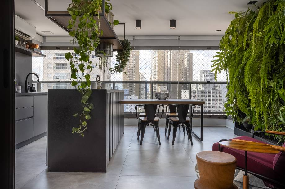O projeto de paisagismo assinado pela paisagista Marianne Ramos transforma o espaço em um verdadeiro oásis urbano, com um jardim vertical que traz a sensação de área externa. Uma poltrona estrategicamente posicionada junto ao jardim proporciona o local ideal para relaxamento e contemplação da vista e das plantas.