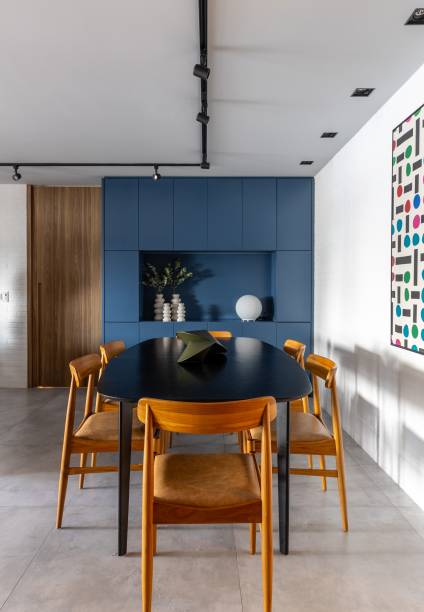 A cozinha, totalmente isolada, com marcenaria azul e azulejos estampados da Lurca na rodabanca, é um espaço que une praticidade e estilo. O mix de cores e estampas traz um toque contemporâneo e jovem ao ambiente, enquanto a ampla circulação proporciona acesso reservado à lavanderia.