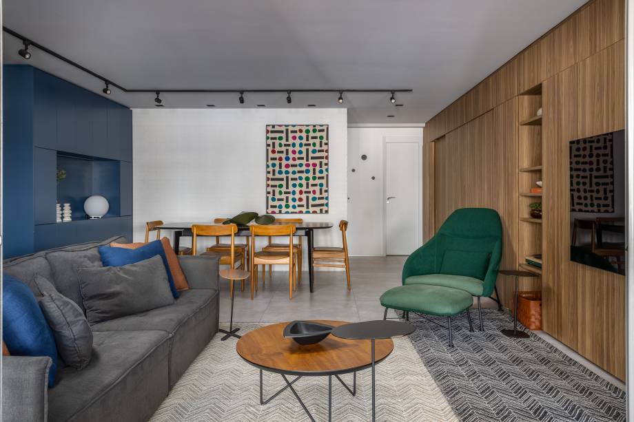 O conceito de espaço integrado é uma das marcas registradas do projeto. No entanto, a arquiteta priorizou a necessidade de privacidade em alguns ambientes. Para isso, a profissional criou alternativas que permitem a fluidez entre os cômodos, sem perder a individualidade de cada um. O destaque do espaço é um painel de madeira que percorre a sala, englobando a chapelaria e mimetizando a porta que leva à cozinha, criando uma estética limpa e coesa.