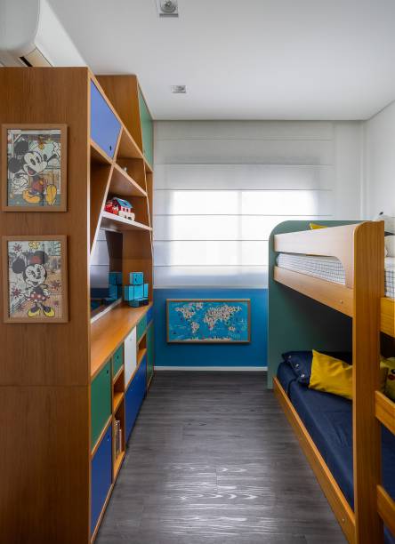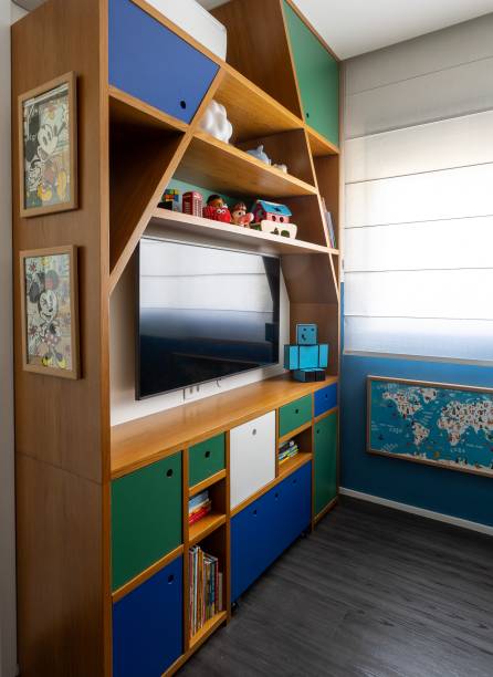 O quarto do filho, por sua vez, é um espaço divertido e lúdico. Com marcenaria sob medida que remete a uma casinha, o ambiente é projetado para atender às necessidades de organização dos pais, ao mesmo tempo em que encanta a criança.