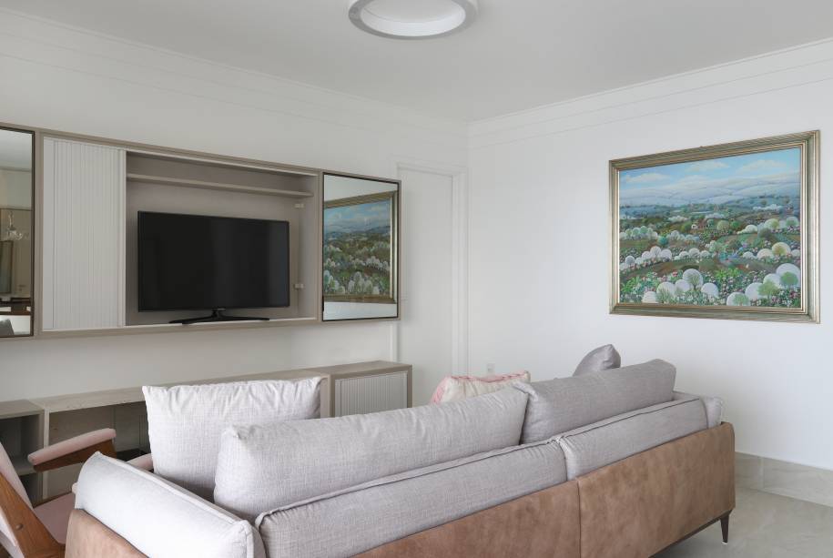 Na sala de estar, um painel camufla a TV com portas de correr espelhadas. O sofá marca a divisão da área social, deixando a sala de jantar isolada do espaço de TV. A mesa de refeição e as cadeiras foram restauradas (eles já existiam no antigo apartamento da moradora), enquanto um armário foi desenhado para guardar as louças.