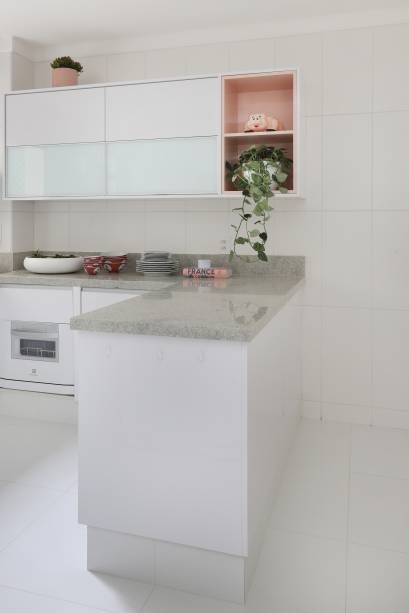 A cozinha total white chama a atenção pela marcenaria sob medida, com detalhes dos nichos rosa em laca. Como a moradora pediu uma bancada comprida para abrir massas, a solução foi criar uma península com pedra de granito branco. Na lavanderia, a máquina de lavar foi embutida na bancada de granito, deixando espaço para a passar roupas do outro lado.