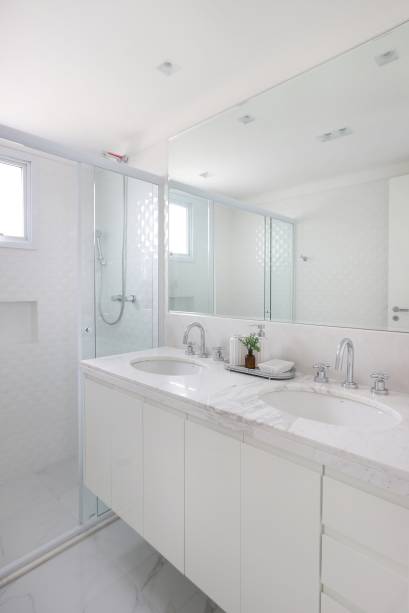 A suíte master tem um pequeno closet bem na entrada do cômodo, todo em marcenaria branca, sob medida. Já o banheiro amplo da suíte, com duas cubas, acompanha os tons de branco do quarto.
