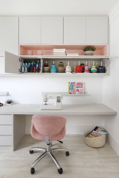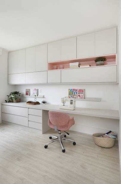 A estrela da casa é o ateliê que ocupa um dos dormitórios. Os profissionais estudaram o layout e visitaram espaços de costura para poder criar um ambiente confortável para o trabalho. “O ateliê de costura era o nosso maior desafio, pois tínhamos que criar um ambiente agradável e funcional para que a moradora conseguisse desenvolver todas as peças de confecção dela”, comenta Antônio Armando. Através de um projeto de marcenaria, todos os materiais ficaram organizados. A bancada extensa facilita o trabalho com tecido e foi revestida especialmente de laca com toque de linho.