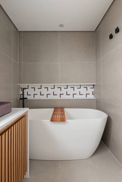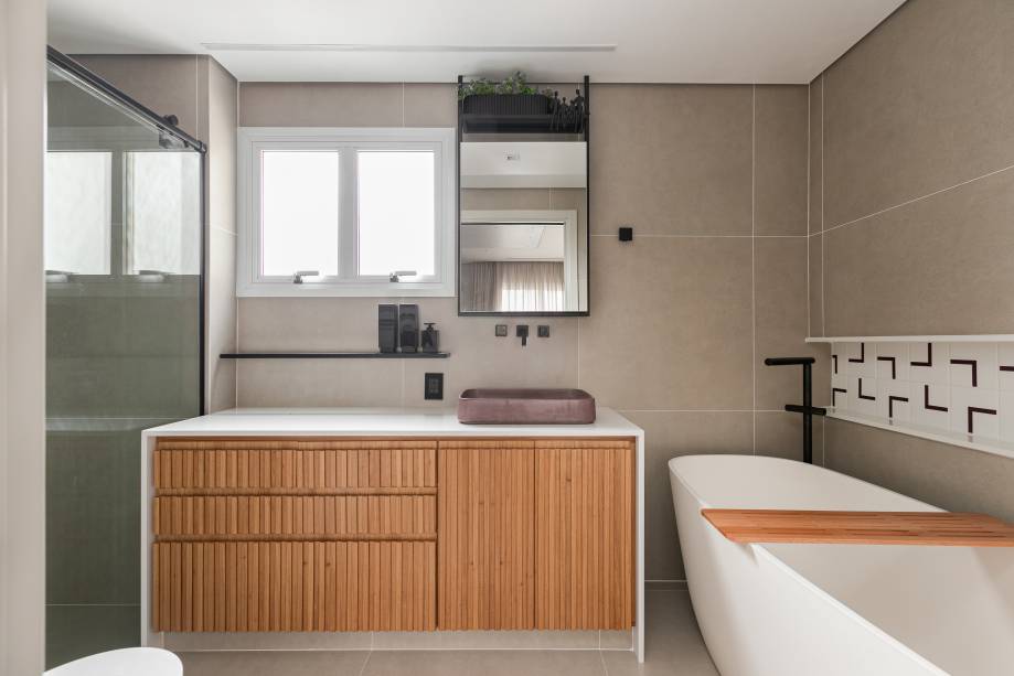 “O maior desafio enfrentado durante a realização deste projeto foi a completa reforma de um apartamento de 50 anos em um período recorde de seis meses. O projeto exigiu duas intervenções estruturais significativas: reforços metálicos para suportar o peso da banheira no banheiro principal e para o spa na varanda. Além disso, as chuvas representaram um desafio adicional, especialmente para a área externa da varanda, que precisava ser impermeabilizada”, revela Natália Salla.