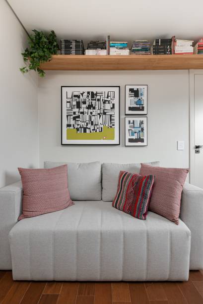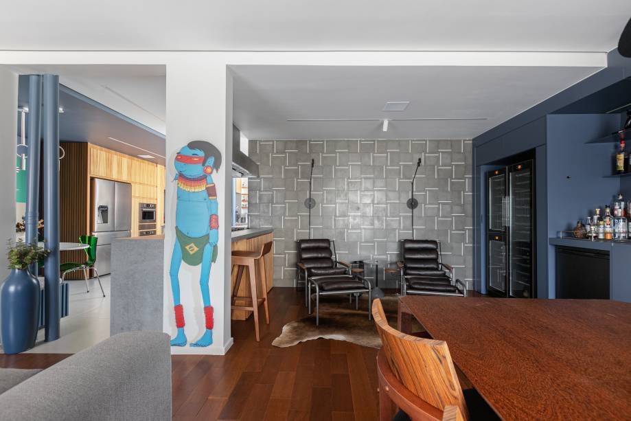 O design brasileiro é o protagonista deste apartamento, que foi pensado para valorizar a cultura e a arte nacional. Cada peça do mobiliário foi escolhida com cuidado, buscando harmonizar forma, função e estilo. Entre os destaques, estão as poltronas do bar e as cadeiras da varanda da Prototyp&, a mesa de jantar e o sofá da Cremme, as cadeiras de jantar e as poltronas da área externa da Fahrer, o aparador, o banco do hall de entrada e o banco do quarto são obras do renomado designer brasileiro Fernando Jaeger e a mesa da varanda é da Traço Objetos.