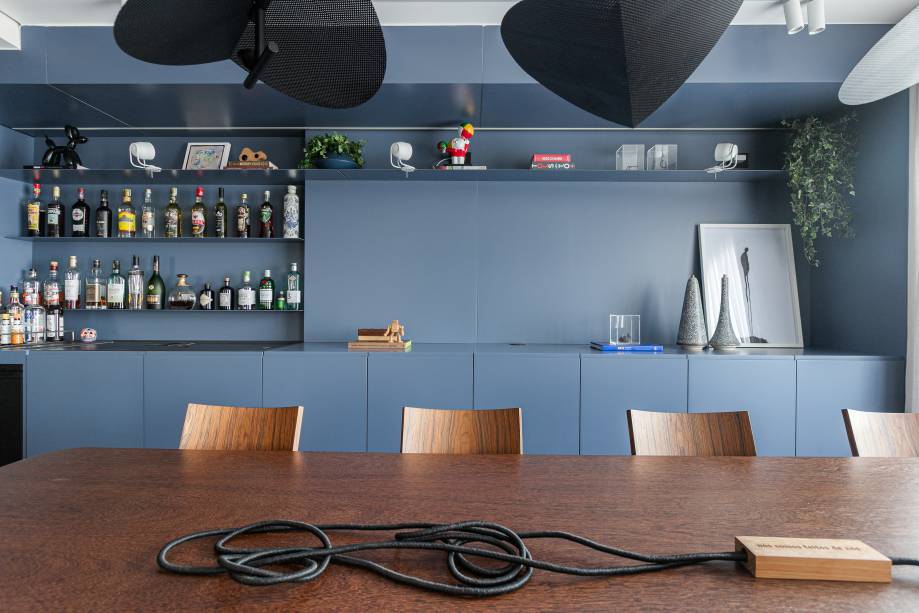 Apartamento de arquiteta tem paleta sóbria com toques de azul e verde e academia