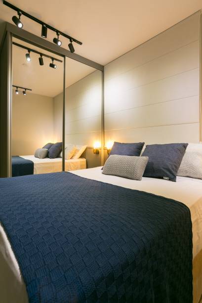 No quarto, a metragem também era pequena. Portanto, o armário foi criado com portas espelhadas de correr para ganhar espaço. Há apenas um criado mudo ao lado da cama, mas como é diminuto não caberia ali um abajur. Assim, a arquiteta precisou ser criativa para encontrar uma solução para uma luminária de leitura. Ela sugeriu adicionar arandelas dos dois lados da cabeceira de MDF. “Este projeto foi muito especial porque o morador topou todas as ousadias que propus, desde o rodapé azul, até o cooler embutido”, comenta Carol.