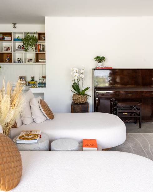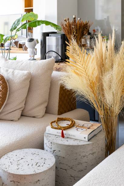 Um dos desafios enfrentados na elaboração do projeto, foi o de renovar os ambientes sem reformas estruturais, uma vez que o imóvel era alugado e o tempo era limitado. No entanto, por meio de intervenções mínimas e da escolha cuidadosa de materiais e objetos de decoração, foi possível transformar o espaço de forma significativa, mantendo a essência do morador.