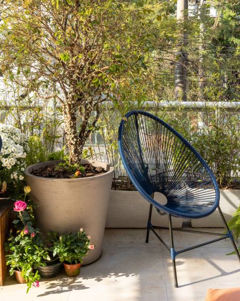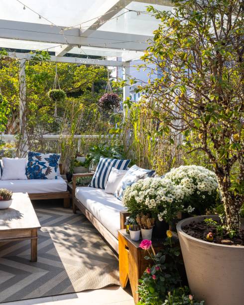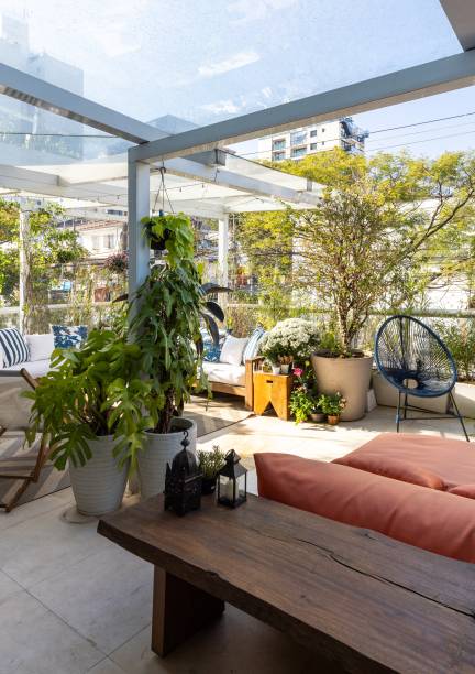 Para trazer a natureza para dentro de casa, a decoração tem tons claros e amplas janelas, além das plantas na varanda e nos interiores. Tão importantes quanto os mobiliários e acessórios, são os espaços vazios, pois são eles que garantem uma atmosfera leve e desobstruída.