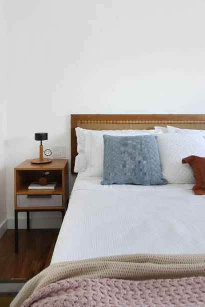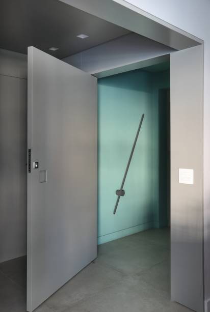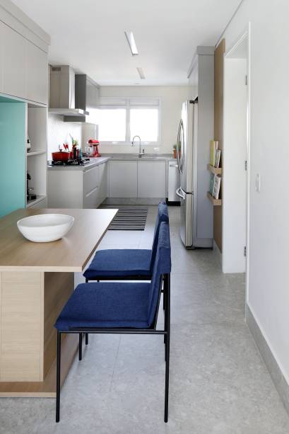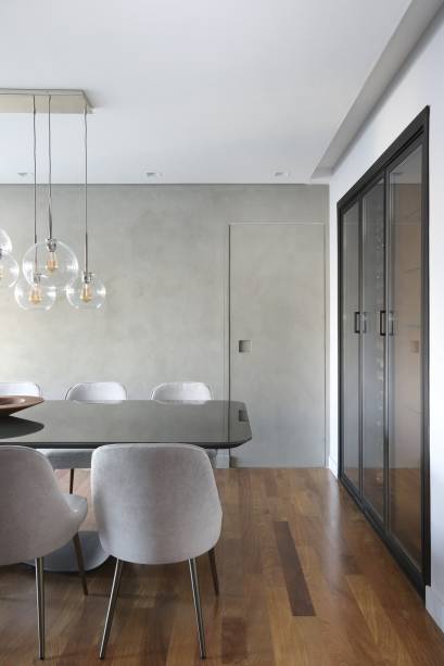 Um dos principais pedidos do casal, a adega ganhou atenção especial. Ela foi instalada na sala de jantar e, para viabilizar o espaço, uma parte do dormitório de serviço precisou ser reduzida. “A adega tem 60 cm de profundidade e um condicionamento de ar especial”, explica a arquiteta.