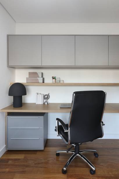 O layout da decoração da sala de estar foi toda modificada para atender os desejos dos moradores. A arquiteta desenhou uma estante com portas sem puxadores, que se abrem por meio do toque, o que trouxe uma ideia de painel de madeira para o ambiente. Além disso, nessa sala foi instalado o escritório com uma porta mimetizada no painel, que ajuda a deixar o visual mais clean e o espaço reservado.